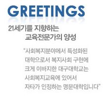 대구대학교는 사회복지특성화대학이며 1982년부터 사회복지대학원을 설치·운영해 온 명문사학입니다. 그 동안 수많은 사회복지 전문 인력을 양성하였으며 졸업생들은 복지사회를 구현하기 위한 전문가로 전국의 사회복지 현장에서 활동하고 있습니다.